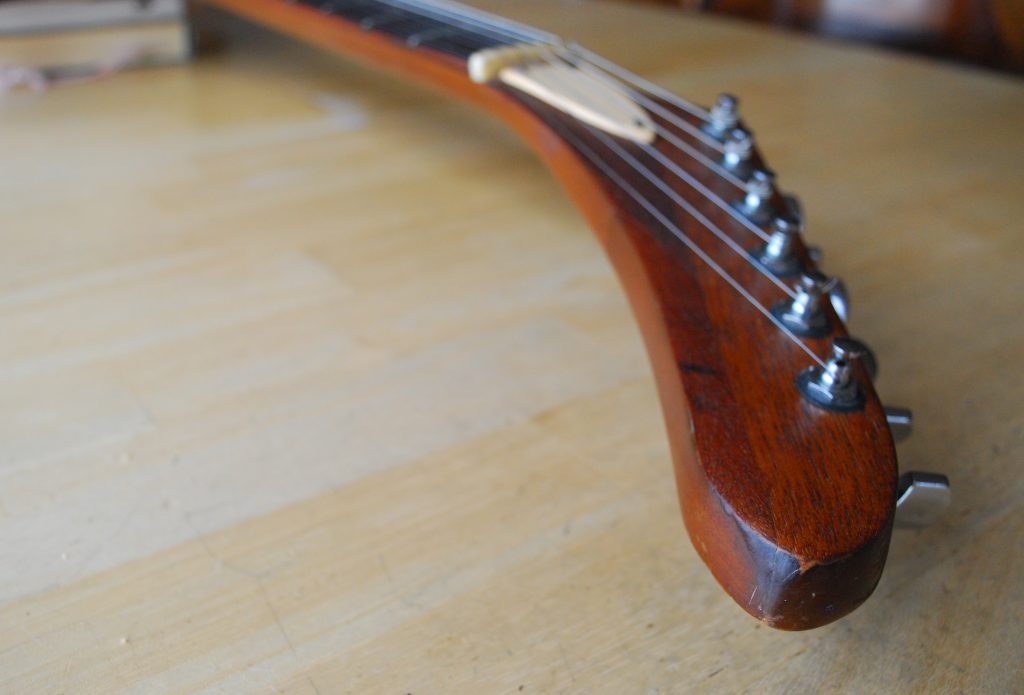 My luthier found this and sent it to me. I have the nearly IDENTICAL guitar! It came to me as the subject of a buddy’s refinishing project. Then he had to move from his then home to his current home. During the move, he lost every part of the instrument! The only metal on it was the truss rod and the frets. No serial, no identifying marks in any way, shape or form on the entire thing. Even my friend couldn’t recall what brand it was. As in the one picture, mine also had at one time what appeared to have been old style tuners and I used mini Grovers in the re-build. The bridge and tailpiece stud measurements were seriously off from the usual Gibson style measurements, so I had to take parts that didn’t fit and make them fit. It all worked very well, luckily. I put in fresh stud inserts and studs and got everything in place satisfactorily. I had to route out the pickup cavities to get standard hummies to fit. I had great help from my luthier and I installed a pair of stock Gibson pickups that are extraordinary in this wood. The grain looks like African mahogany and is very, very light and comfy to wear on the strap. The neck seems to be, by the looks of it, Honduran mahogany, however, the jury is still out on that.